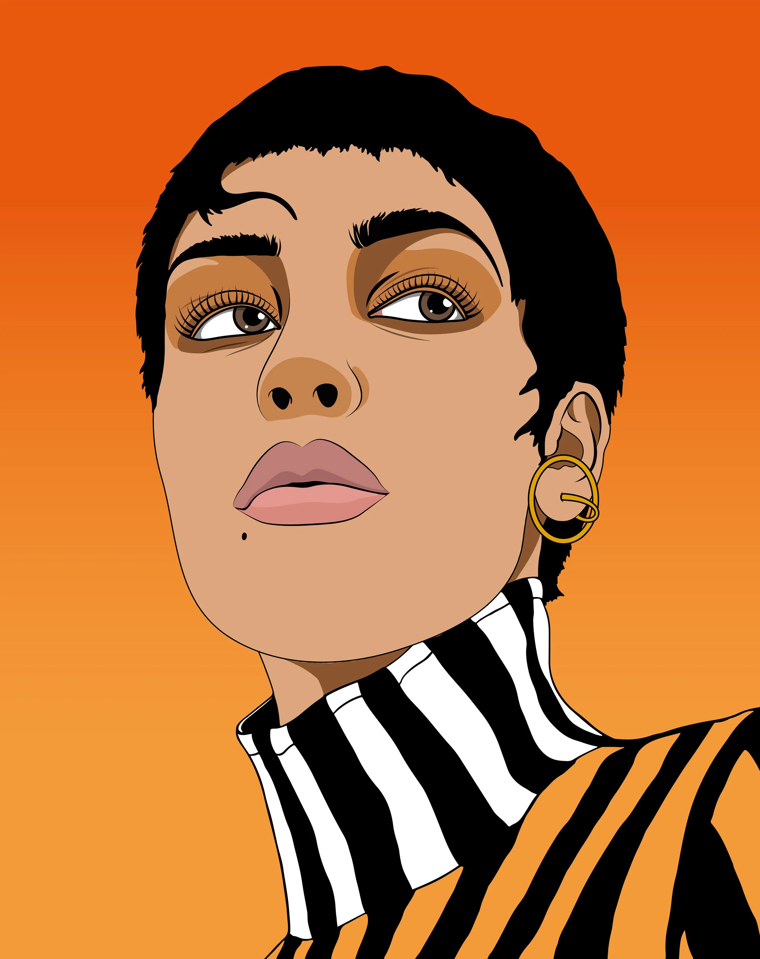 “Jorja” is an Illustrator based project in which I depicted the music artist, Jorja Smith, through a digital, comic/ pop art style. With its use of bold colors, flat, contrast shading, and smooth line work, this piece is a fun cartoonized portrait that was as enjoyable to make as it looks. First, I used the pen tool to draw the portrait in its entirety. I started with the subjects eyes (as eyes are usually the first thing I gravitate to when drawing) and then worked my way outward, drawing the other facial features. Next, I expanded on to the facial structure, hair, and clothing. Once I completed my line work, I then moved to the live paint bucket tool or “coloring” portion of the piece, similar to how you would fill in a coloring book. In some portions of the work, I added color within lines and in other portions and shadings, especially within the face, I created shapes to create more of an iconic “pop art” aesthetic.